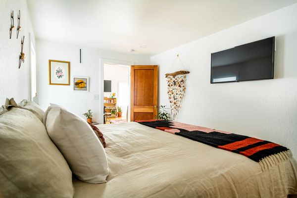 The bedroom offers a plush king size bed with linen pillow cases and duvet, and white Egyptian Cotton sheets. A super comfy chair and ottoman near the window provide a perfect reading nook or place to kick back in the bedroom to watch Netflix & chill. Blackout shades have you sleeping easy!